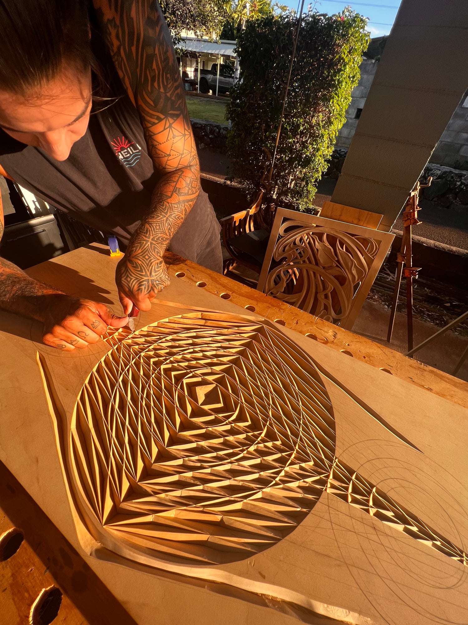 Niko Rocha, known professionally Universe Carvings, is a highly skilled wood carver specializing in exquisite geometric chip carvings. Based out of Hawaii, Niko's work is a fusion of nature's organic beauty and the precision of geometric patterns, drawing inspiration from the intricate designs found in nature and the captivating works of MC Escher. With a passion for woodcarving ignited in 2020, Niko has quickly risen to prominence in the woodworking community. His dedication to mastering the art of chip carving has led to his work being featured in prestigious exhibitions, including the Hawaiian Craftsmen Exhibition, where his pieces garnered acclaim for their meticulous craftsmanship and captivating designs. Niko's artistic journey is deeply rooted in the natural landscapes of Hawaii, where he finds inspiration in the lush forests, rugged coastlines, and vibrant flora. His fascination with geometry adds a mesmerizing depth to his carvings, creating intricate patterns that mesmerize the viewer and evoke a sense of wonder.In addition to his exhibition successes, Niko's talent has been recognized by Woodcarving Illustrated Magazine, where his work has been featured, further solidifying his reputation as a master woodcarver. Working out of his home studio in Hawaii, Niko continues to push the boundaries of his craft, creating stunning pieces that blur the lines between art and craftsmanship, leaving a lasting impression on all who encounter his work.
